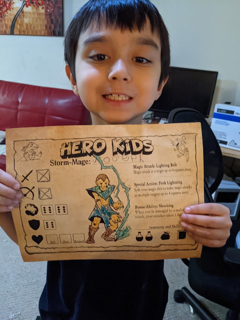 And lo and behold, there was Hero Kids, a dead ringer for the simplified concepts Jms was eager to use in a tabletop RPG. After shopping around, I went ahead and got the entire Fantasy bundle at a steep discount, because this mom is quite frankly too tired to come up with her own campaign adventures. I emailed Jms a copy of the core book, and we went over the rules and pre-made heroes. Jms very much wanted to be a Hunter, and since I wanted him to have a full-size character sheet that didn’t also murder my printer toner, I resized the corresponding hero card from the printer-friendly pdf and printed that out for him. Joseph wanted to be a Storm-mage, and to the surprise of absolutely no one, my semi-feral youngest picked Wolfchild for his character (which I subsequently called Wildchild throughout the first adventure, because I definitely read way too many Image comics in the 90s.)