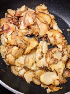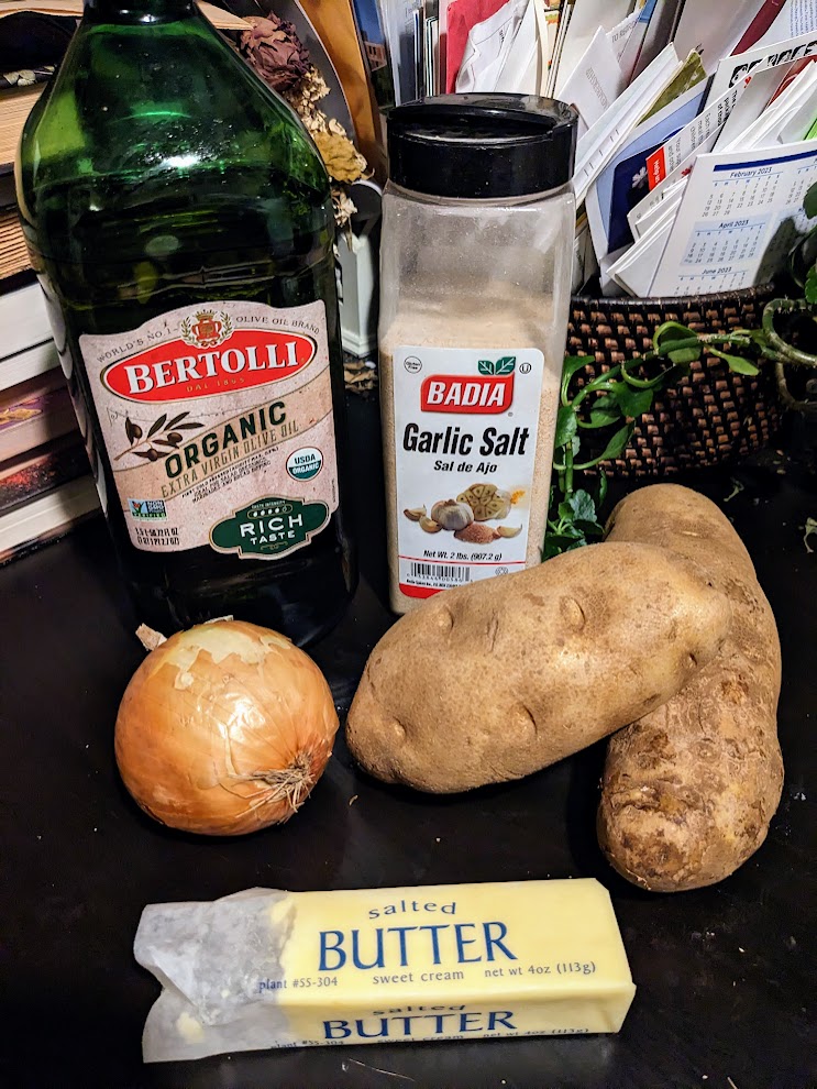 Well, I thought they’d be not-too-hard anyway. Setting up the dish was quite easy, tho I did take a leap of faith in assuming that the potatoes were to be added to the pan that already had the onions in it. Onions take forever to caramelize anyway, so I figured it was the smart move. Also, despite writing a weekly book-related cooking column for almost seven years now, I’m not an intuitive cook, much less a trained one. I am however good at following and, perhaps more importantly to my readers, evaluating recipes because I come to cooking as a dedicated layman.