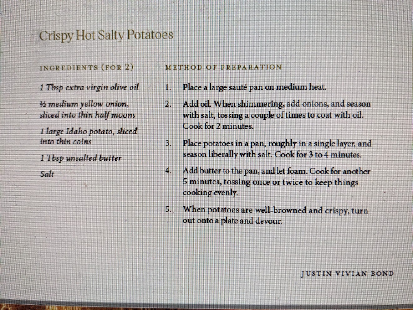 And because I am the kind of person who loves to cook from books, I decided to try my hand at one of the recipes. There are varying degrees of complexity on show here — and I’m not gonna lie, Kia Cook’s essay on the Popeye’s Spicy Chicken sandwich is by far my favorite, if recipe-free, entry, making me reconsider cooking in favor of driving over to the closest Popeye’s instead — but I ultimately decided to make the not-too-easy, not-too-hard Crispy Hot Salty Potatoes by Justin Vivian Bond (recipe above. Sorry for the image quality: it’s a picture I took of the e-galley.)