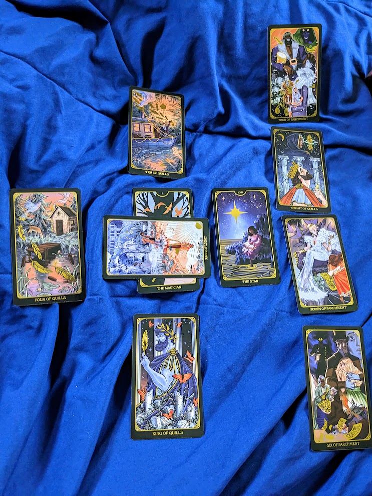 Ofc, no Tarot critique would be complete without a sample reading. Unsurprisingly, I used the Celtic Cross to ask a pertinent question that I’ll decline to share with y’all (tho experienced readers may well guess what I asked from the picture above!) I was actually really impressed with the thoughtful, reassuring tone the cards gave me in response. As far as advice goes, this was the sensible older sibling of decks, sort of a cross between Meg March and Elinor Dashwood at the end of their respective books.
