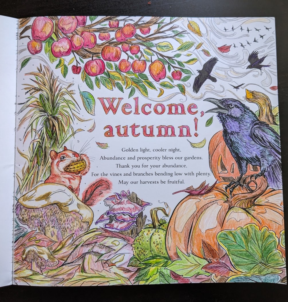 Sara Richard’s illustrations here are beyond amazing. Not only has she done a terrific job of communicating Green Witch values and symbolism with each page, she’s also done it in a way that invites the reader to add life and personalized choices via color to her outstanding images. A good coloring book isn’t just about pretty pictures: having images that are fun to color in can depend so much on the illustrating artist’s line choices, and Ms Richard’s just knocks that assignment out of the park with her clever use of line weights and spacings. By the end of each piece, as I felt with my own version of Autumn rendered above, I felt like she and I, with Ms Murphy-Hiscock’s guidance, had partnered together to joyfully bring a little bit more loveliness into the world.