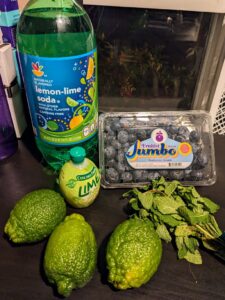 3 blueberries, 1 lime wedge and 1 mint sprig for garnish