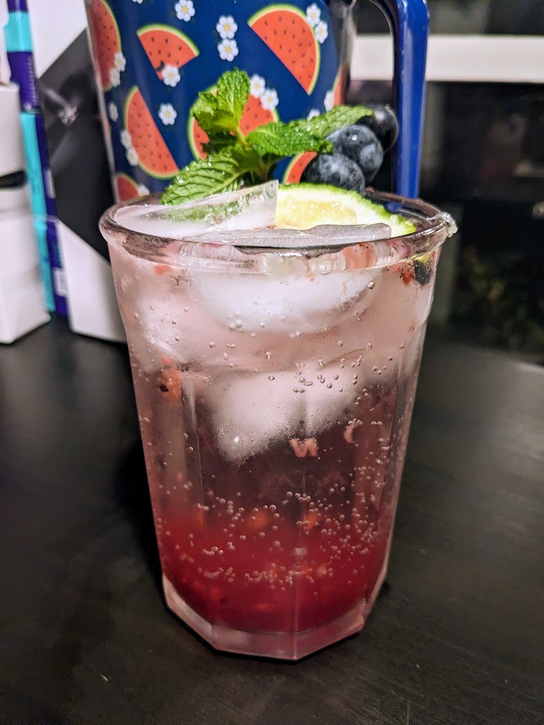 With that in mind, I decided to try out the Blueberry Mint Refresher recipe. Since I’m currently hosting teetotal relatives — the kind that don’t believe that one can actually “remove” alcohol, sigh — I figured this would be the safest drink to make for a group. Also, the ingredients are relatively simple and easy to stock up on, or so I thought before finding my local grocery stores empty of mint for the week bracketing New Year’s. I finally found several bunches of mint huddled in amongst the parsley, and was able to set to making this intriguing drink, lightly edited here for format: