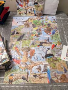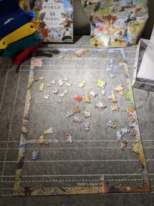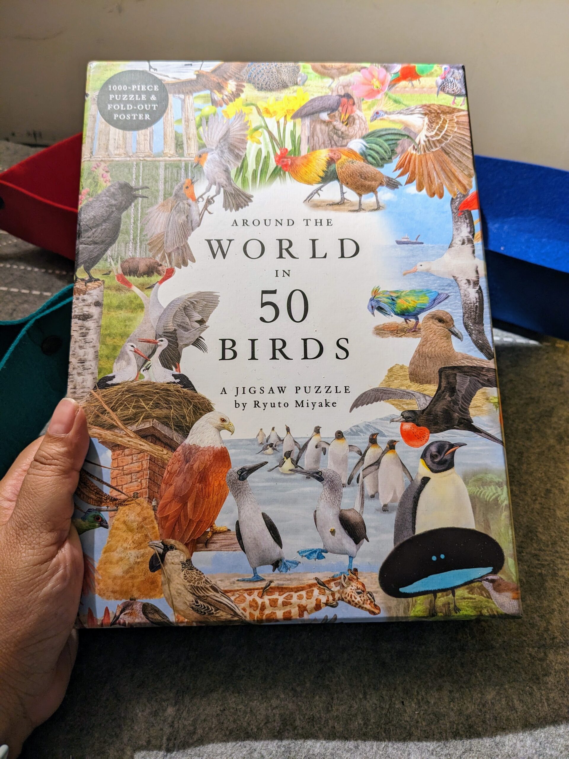 This reputation is also, I believe, one of the reasons I received this gorgeous jigsaw puzzle. I had the chance to review the book it’s based on, Around The World In 80 Birds by Mike Unwin & Ryuto Miyake, back in 2022 so absolutely jumped at the chance to take a look at the jigsaw puzzle derivative. It also gave me an excuse to finally set up my puzzle/craft table! Up until last year, I’d done all my jigsaw puzzles at my former best friend’s house, in order to protect my games from my kids’ itchy fingers. Now that my kids are a little older, I figured I could risk setting up my own table. My middle child could not, alas, resist the temptation of messing with the frame once I’d put it together, but a stern talking-to fortunately cured him of the impulse for the rest of my puzzle-solving duration.