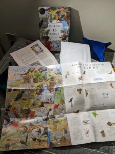 Around The World In 50 Birds comes in a sturdy box with a glossy fold-out poster that not only shows what the completed puzzle will look like, but also contains a description of the fifty birds selected for it. It was lots of fun to put together a bird then consult the poster for more information on it. Divided geographically, the birds are each described by their common English names and scientific names. Each bird also gets a surprisingly dense paragraph that’s often related to the way it’s portrayed in the puzzle.