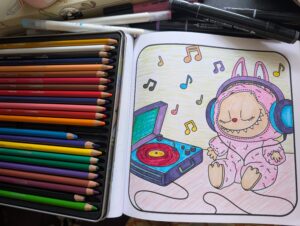Since I personally shudder every time I see a fuzzy toy at the beach, I skipped over the pages where Lafufus are frolicking on the sand and decided to color in a picture of one listening to a record player indoors. I used a mixture of markers and coloring pencils, which I find work best when testing out coloring books. I also placed a sheet of scrap paper underneath to catch any ink bleedthrough, tho I was very pleased that there didn’t seem to be any.