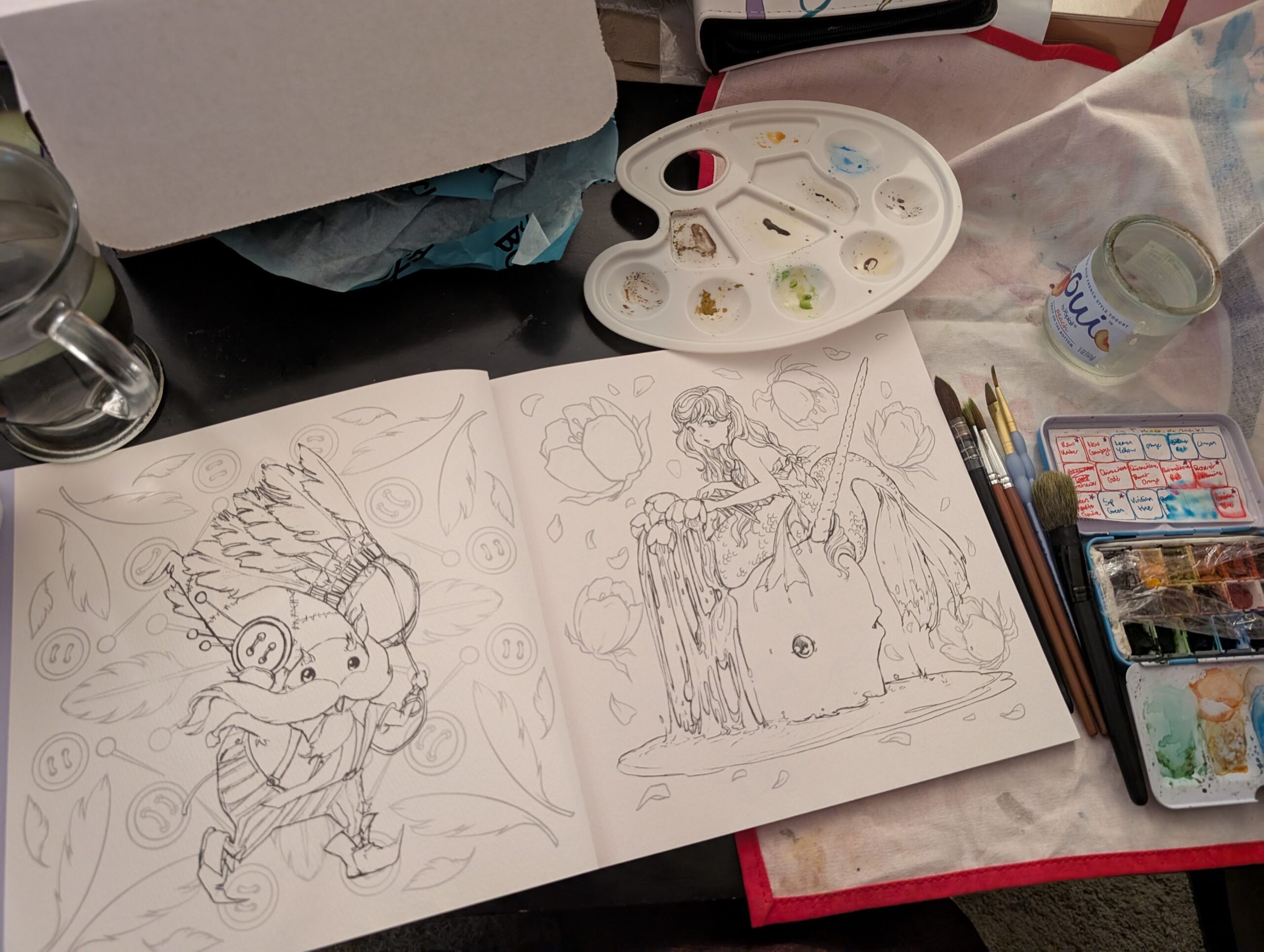 I cover quite a few coloring books here at The Frumious Consortium, but this is the first time I’ve ever seen a mass market volume specifically designed for watercolor and ink. I hope it’s not the last tho because this is genuinely a superlative product for anyone looking to paint some adorable manga-inspired scenes.
