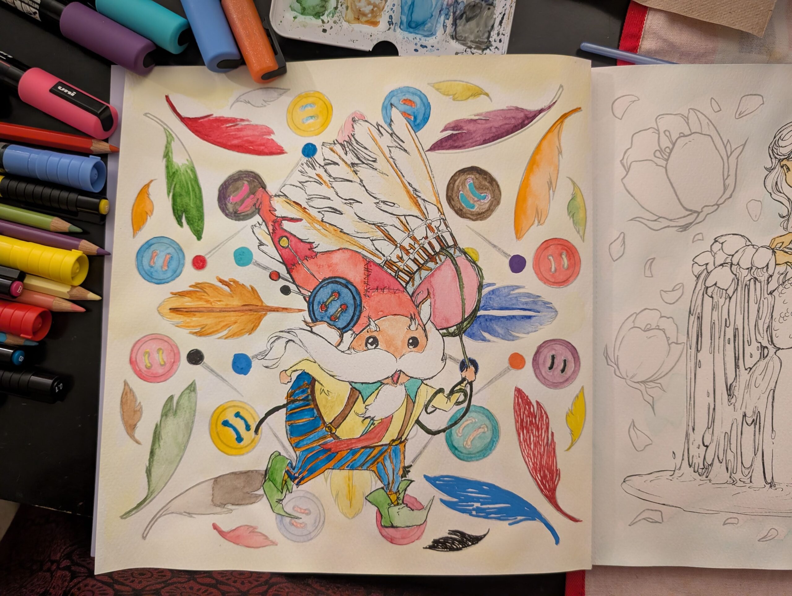 I actually did the washes for both pages first, as I definitely intended to do both, should time allow. It did not, as I definitely immersed myself in painting a variety of feathers in the background of the first piece. This was partially an excuse to try out all my colors and media, but it also brought joy to my chaotic maximalist heart.