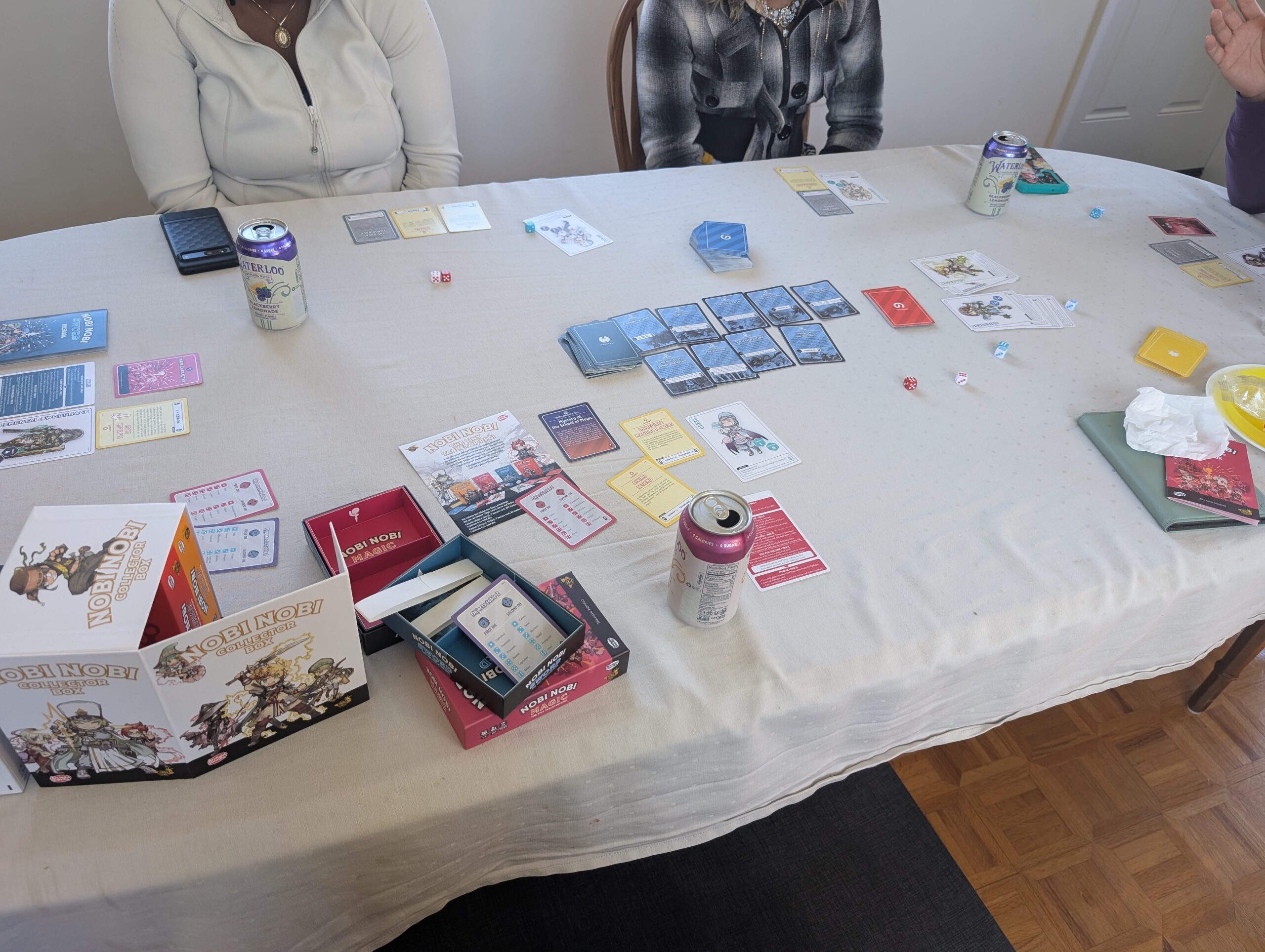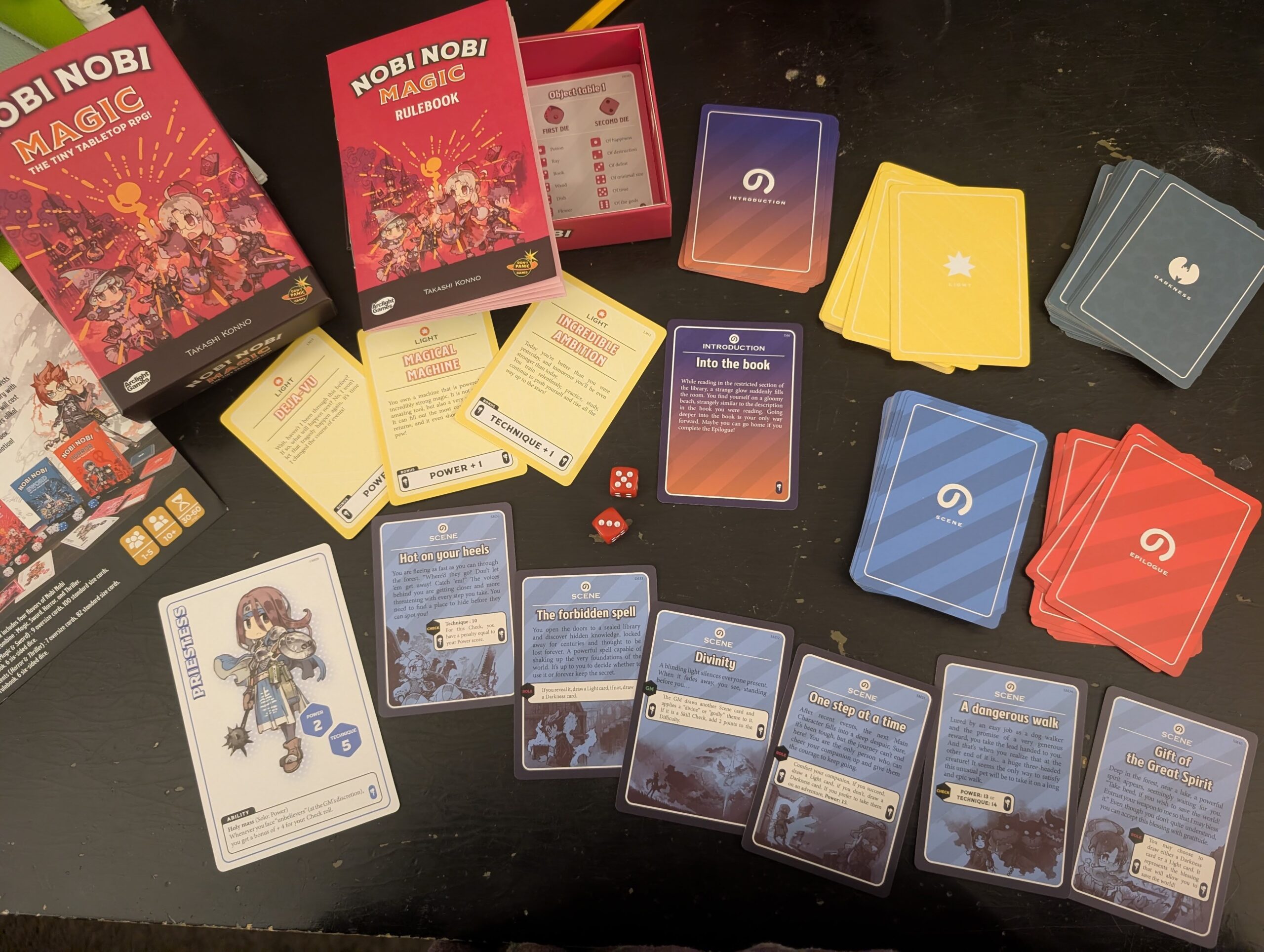 The whole experience took us about two hours, partly because we were happy to embroider on our stories and partly because players’ kids kept running in and out of the play area to ask for things. It was a nice, light roleplay experience that gave everyone plenty of chance for heroics and cooperation tho. It definitely lives up to the name, as Nobi is slang for Novice in Japanese. The game has just the right level of storytelling and crunch for people new to RPGs, tho probably requires at least a little improv experience to be able to credibly stitch one scene on to another. I’m absolutely planning on getting the expansion now, even if it is in euros and who effing knows what the currency exchange rates are going to be like. We’ll have to see, but I can attest to the base game, at least, being well worth the price!